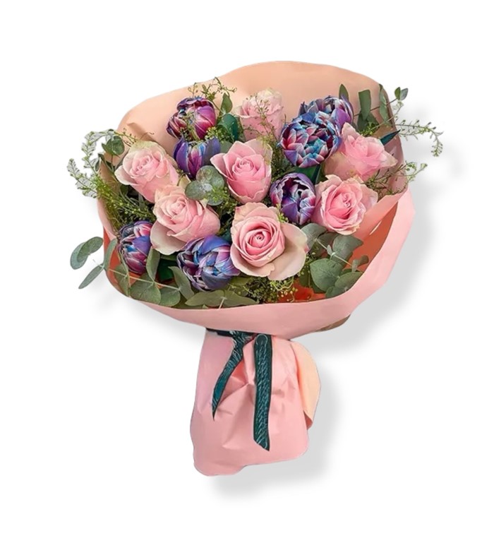 Zarafetin simgesi pembe güller, dikkat çekici galaksi laleler ile bir araya gelerek modern ve şık bir buket tasarımı oluşturur. Pembe Gül & Galaksi Lale Buketi, özgün görünümüyle sevdiklerinize etkileyici bir sürpriz sunar.