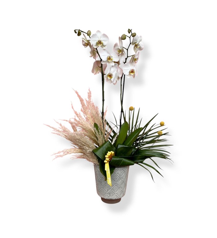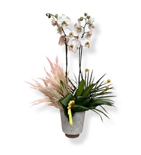 Şıklığı ve zarafeti bir araya getiren Orkide Taş Vazoda, beyaz orkide çiçeklerinin taş vazoda özenle sunulduğu özel bir tasarımdır. Modern ve sofistike görünümüyle ev veya ofis dekorasyonuna estetik bir dokunuş katar ve sevdiklerinize anlamlı bir hediye sunar.